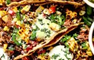 Braised shredded carnitas (pork) meat. Seasoned yellow rice, pico de gallo, shredded lettuce, and cilantro aioli. Flour tortillas.