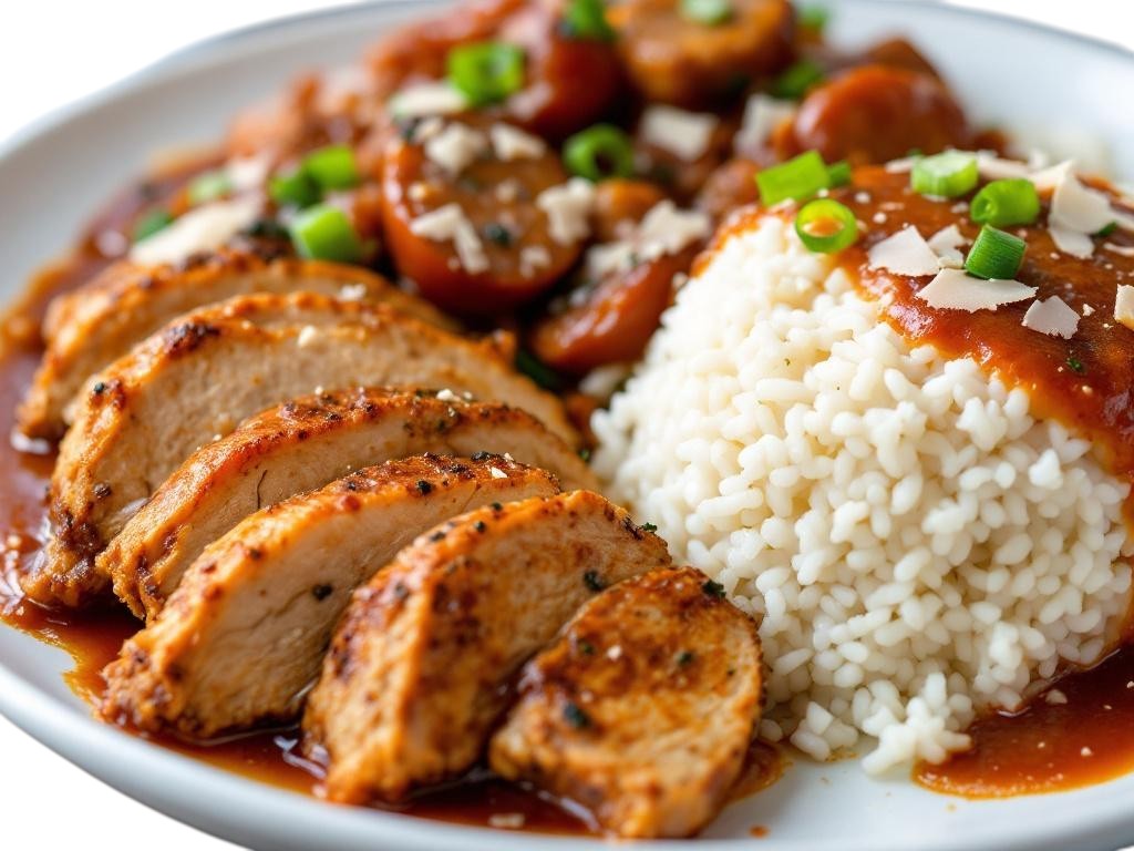 A Freshchef hit! Cajun roasted chicken, andouille sausage, white rice, creole sauce, scallions, and shredded parmesan cheese.