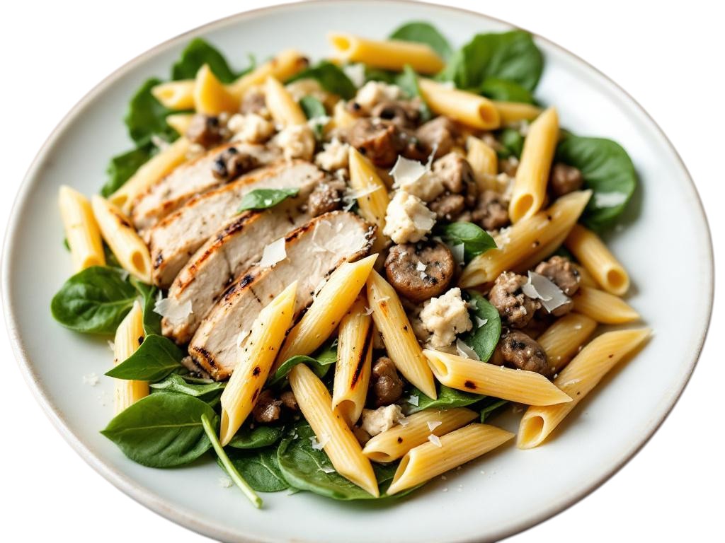 Penne pasta with a bed of spinach, grilled chicken, crumbled Italian sausage, mushroom cream sauce, and shaved parmesan cheese.