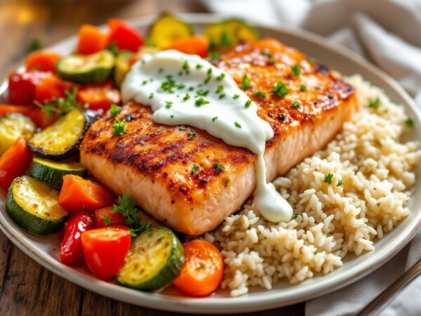 Roasted salmon filet served with white rice, roasted vegetables, chickpeas, and tzatziki sauce.