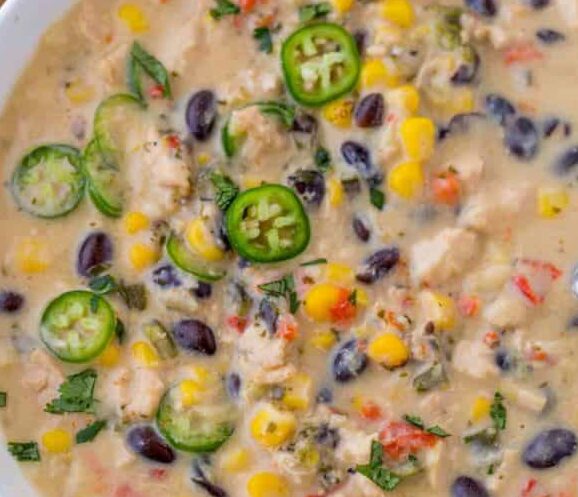 Cream-based soup with roasted poblanos, corn, black beans, tomatoes, lime, cilantro, and grilled chicken.